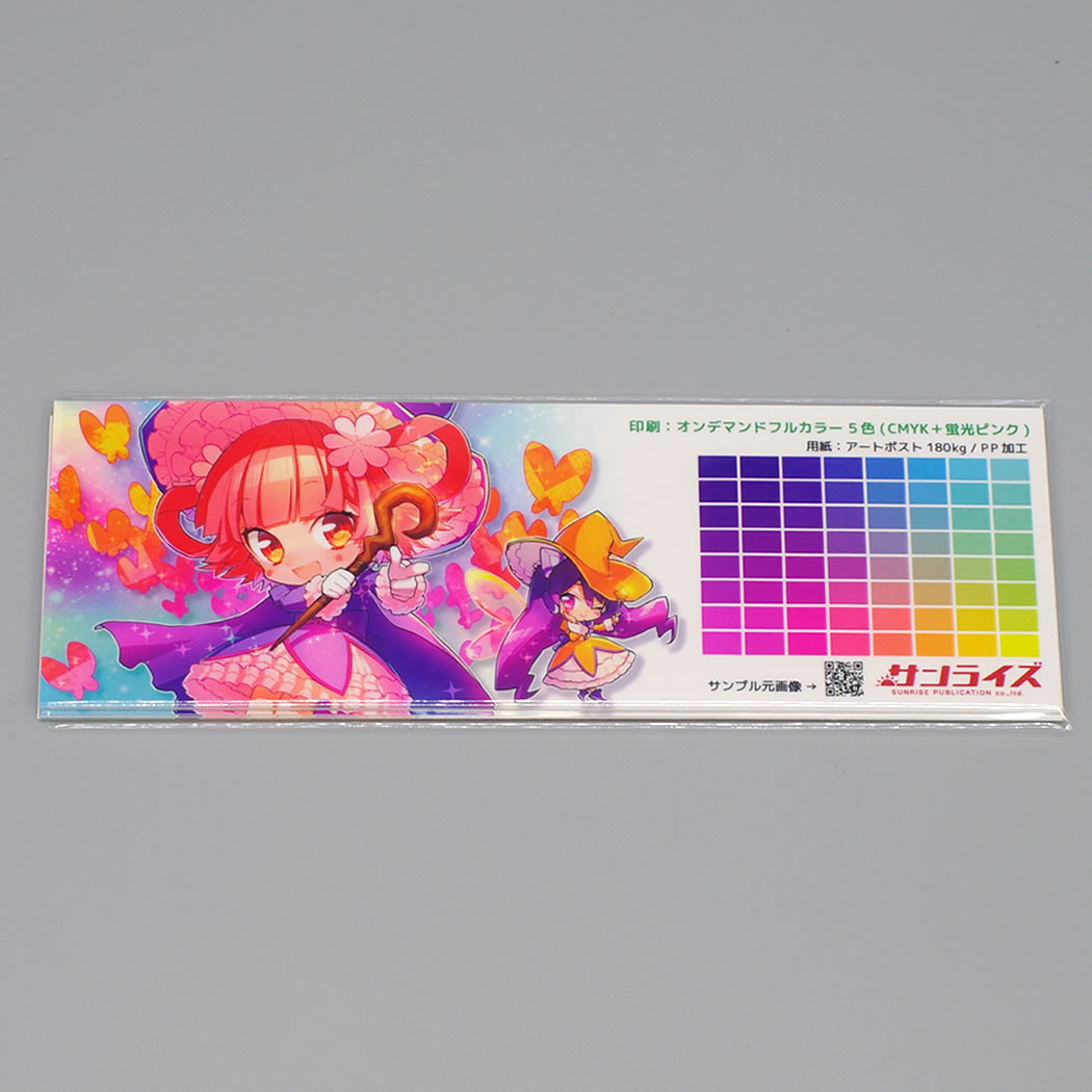 各種オンデマンド印刷を施した短冊状の見本です。4色と5色(CMYK+蛍光ピンク)の比較や表面加工(PP・マット)の現物見本としてご利用ください。